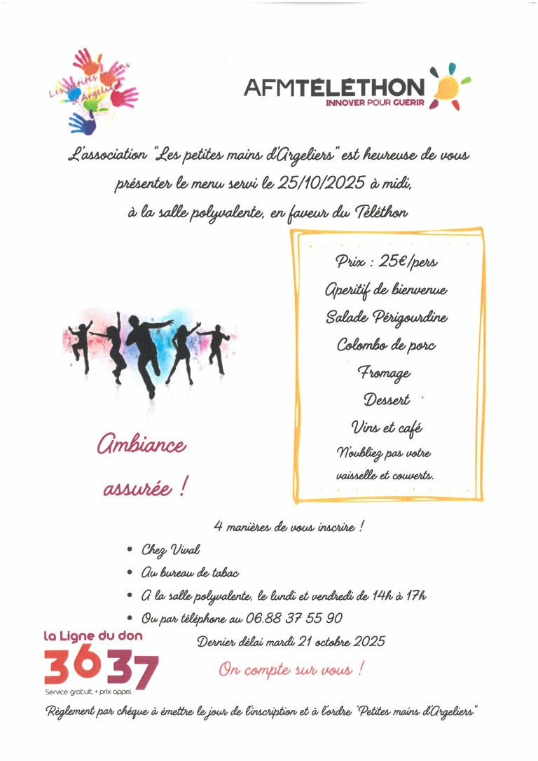 L'association "Les Petites mains" organise un repas dansant le 25 octobre 2025 à Midi à la salle Polyvalente au profit du Téléthon.