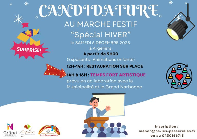 En collaboration avec la Mairie, le Grand Narbonne et les Passerelles un marché festif d hiver aura lieu le samedi 6 décembre 2025 sur la promenade à partir de 9h.